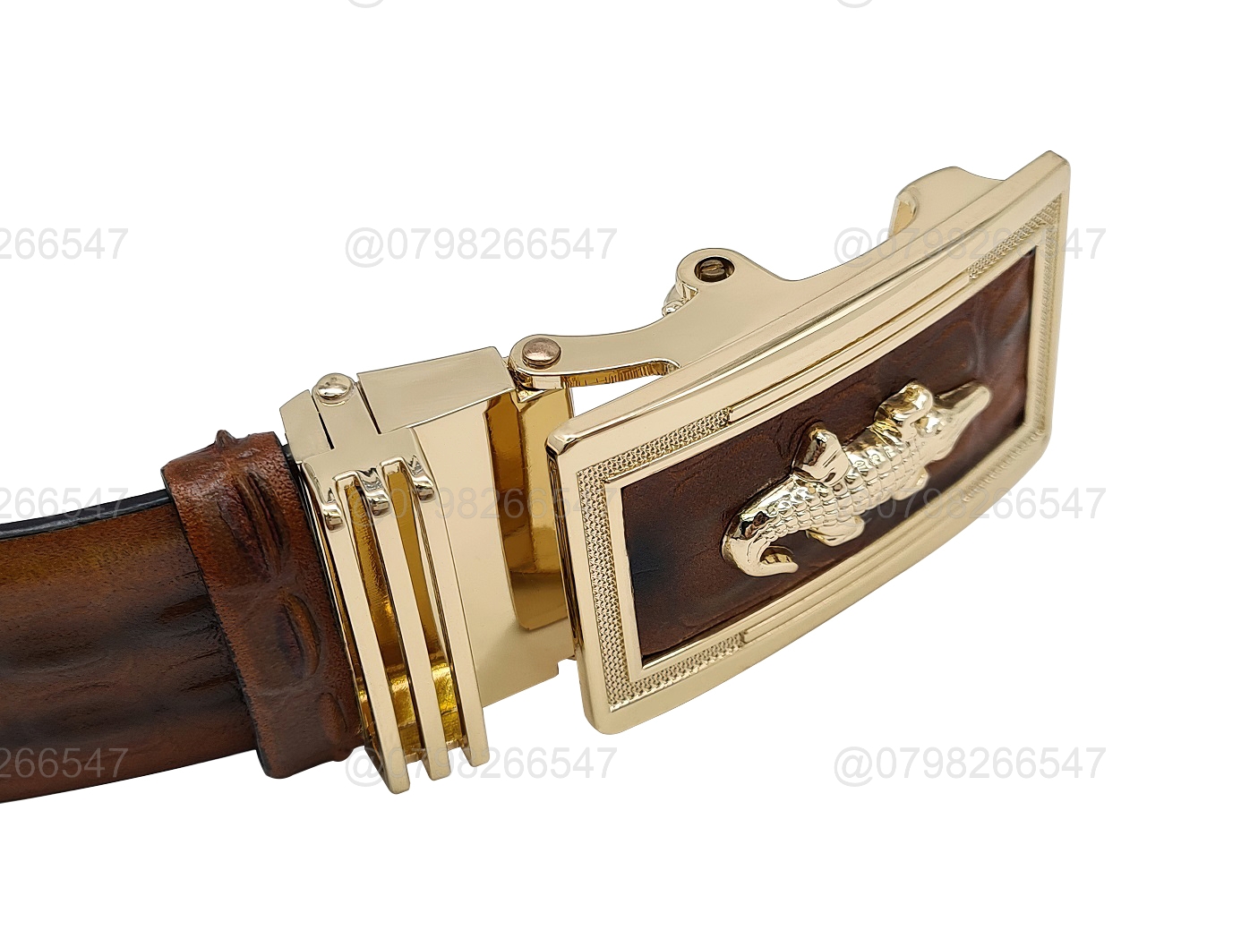 Dây thắt lưng nam da bò dập vân cá sấu DHM-345 | Khoá tỳ in mặt nổi cá sấu vàng | Bảo hành 12 tháng